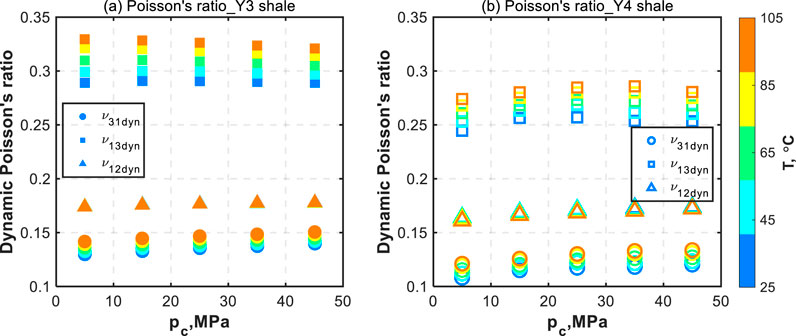Figure 9. Three dynamic Poisson's ratios (ν 31dyn, ν 13dyn, ν 12dyn) as functions of the confining pressure (p c) and temperature (T) for (a) #Y3 and (b) #Y4 shales.