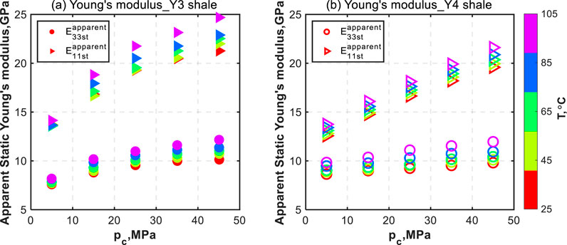 Figure 10. Two apparent static Young’s moduli (E 33st apparent, E 11st apparent) as functions of the confining pressure (p c) and temperature (T) for (a) #Y3 and (b) #Y4 shales.