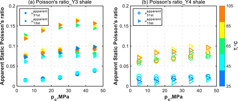 Figure 11. Two apparent static Poisson’s ratios (ν 31st apparent, ν 13st apparent) as functions of the confining pressure (p c) and temperature (T) for (a) #Y3 and (b) #Y4 shales.