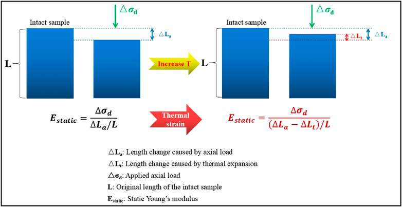 The anisotropic and distinct expansion behaviors of the shale components alter the internal structure of the rock mass in the process of heating, which further leads to changes in rock elastic or mechanical properties. From a dynamic perspective, porosity is the first-level influencing factor for the ultrasonic velocities. On the one hand, thermal expansion of solid grains causes grain rearrangement and crack propagation, increasing porosity (Hassanzadegan et al., 2014; Li and Wong, 2017; Gabova et al., 2020). On the other hand, solid grains and their contacts are thermally softened in the process of increasing temperature (Wang and Nur, 1988). Both factors contribute to the decrease in ultrasonic velocity with increasing temperature (Figure 7). Subsequently, the calculated dynamic Young’s moduli and Poisson’s ratio (see Figures 8, 9) demonstrate decreasing and increasing trends with the increasing temperature, respectively, if the bulk density changes in the process of heating are ignored. When mentioning the apparent static elastic properties, as shown in Figure 12, when applying an axial load to the rock sample, the static Young’s modulus is the ratio between the applied axial stress and the induced axial strain at room temperature. However, when the temperature increases, the rock will expand, which induces a thermal strain in the opposite direction of the compression. The servo-controlled system will maintain the axial stress at a constant value, but the recorded strain is the sum of strains induced by axial load and strains induced by thermal expansion. Thus, the static Young’s modulus is reduced compared with that at room temperature (Figure 10). In the radial direction, the radial strain induced by the axial load and the thermal strain induced by thermal expansion have the same direction. Thus, the apparent static Poisson’s ratio would increase with increasing temperature (Figure 11).