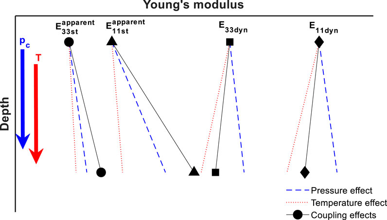 Figure 13. Schematic of the coupling effects of confining pressure (p c) and temperature (T) on dynamic and static Young’s moduli of organic shales. Note: the vertical axis schematically indicates the burial depth.