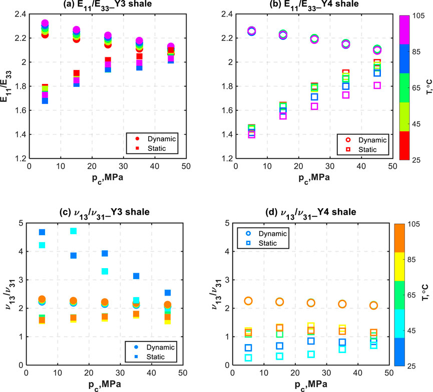 Figure 14. Dynamic and static anisotropy degree, E 11/E 33, as functions of the confining pressure and temperature for (a) #Y3 and (b) #Y4 shales; ν 13/ν 31 as functions of the confining pressure and temperature for (c) #Y3 and (d) #Y4 shales.