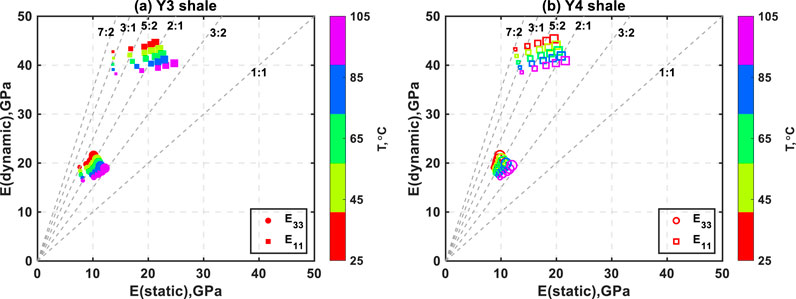 It is acknowledged that differences between dynamic and static elastic parameters exist (Fjær, 2019). Establishing an accurate dynamic-to-static transformation model is critical for many geoengineering applications. However, with respect to the dynamic–static elasticity mismatch, most previous investigations focus on the effects of stress/pressure (Sone and Zoback, 2013; Ong et al., 2016; Ramos et al., 2019; Wang et al., 2021a; Han et al., 2021; Wang et al., 2025). Little research investigates the temperature effects on the dynamic–static mechanical relationships, let alone the combined pressure-temperature effects. To reveal the mechanism for dynamic–static elasticity differences under in situ conditions, we innovatively provide an experimental procedure to jointly evaluate temperature-pressure effects on dynamic–static relationships in anisotropic shales. The findings have significant implications for many geo-applications, like reservoir evaluation, hydraulic fracturing design, and stimulation strategies. The law of “convergence of dynamic and static modulus anisotropy at high pressure and divergence at high temperature” revealed by the experimental data provides a valuable in situ parameter correction benchmark for cross-scale geoengineering modeling and effective reservoir stimulation.