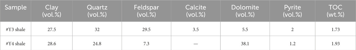 Figures 2, 3 show the thin section and scanning electron microscopy (SEM) images for #Y3 and #Y4 in directions perpendicular and parallel to bedding planes, respectively. Figures 2b, 3b show that clay minerals constitute the main matrix of the rock, while solid grains are distributed in a dispersed manner. Figures 2a,c, 3a,c show that the solid grains of #Y3 shale are dominated by siliceous minerals, like quartz or feldspar, while dolomite minerals can be seen in #Y4 shale, which is in accordance with the results of XRD analysis in Table 1. As shown in Figures 2d, 3d, clay minerals are aligned in the direction sub-parallel to bedding planes, indicating a transversely isotropic structure (Wang et al., 2021a). Black organic matter is intertwined with clay and solid grains and shows a preferred orientation along the bedding plane. The kerogen exhibits a lenticular texture with visible organic pores. Additionally, although shales are quite consolidated, it is unavoidable to create intergranular or intragranular microcracks during core recovery due to stress relief and cooling (Li and Schmitt, 1998). Such microcracks in the selected shales are preferentially aligned in directions sub-parallel to bedding planes.