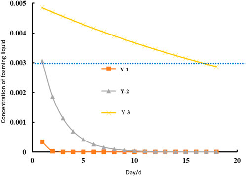 For high liquid production wells (e.g., Well Y-1, with a daily liquid production of 2.936 m3/d). Owing to the high liquid discharge rate, the foam drainage agent concentration droped to below 0.3% within 1 day. Thus, the injection cycle was set to 1 day, and the daily supplementary dosage must reach 14.68 kg to maintain the effective concentration.