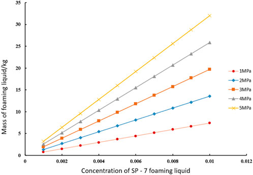 Differences exist among the curves for different casing-tubing pressure differences. The larger the casing-tubing pressure difference, the higher the mass of the foaming liquid at the same foaming liquid concentration. For example, when the foaming liquid concentration is 0.006, the mass of the foaming liquid under a 1 MPa casing-tubing pressure difference is approximately 10 kg, while that under a 5 MPa casing-tubing pressure difference is approximately 20 kg. This demonstrates that the casing-tubing pressure difference has a significant impact on the mass of the foaming liquid; a larger casing-tubing pressure difference can promote the retention of more foaming liquid in the wellbore. This may be associated with the casing-tubing pressure difference affecting factors such as wellbore liquid loading, further verifying that the initial dosage of the foam drainage agent (which is related to the mass of the foaming liquid) has a significant positive correlation with the casing-tubing pressure difference.