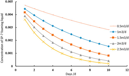 The curve corresponding to a flow rate of 0.5 m3/d remains consistently at the highest position, indicating that the concentration of the foaming liquid exhibits a relatively slow decrease at this flow rate. The curve corresponding to a flow rate of 2.5 m3/d remains consistently at the lowest position, indicating that the concentration of the foaming liquid exhibits the fastest decrease at this flow rate. The curves for the remaining flow rates lie between these two extremes, following the trend that the larger the flow rate, the faster the concentration of the foaming liquid decreases within the same time period.