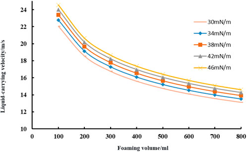 The curve corresponding to a surface tension of 46 mN/m remains consistently at the highest position, indicating that under the same foaming volume, the critical liquid-carrying velocity for this surface tension is the largest. In contrast, the curve corresponding to a surface tension of 30 mN/m remains consistently at the lowest position, indicating that the critical liquid-carrying velocity for this surface tension is the smallest. This demonstrates that at the same foaming volume, the larger the surface tension, the higher the critical liquid-carrying velocity. Additionally, when surface tension is low, the effect of foaming volume on reducing the critical liquid-carrying velocity is more pronounced.