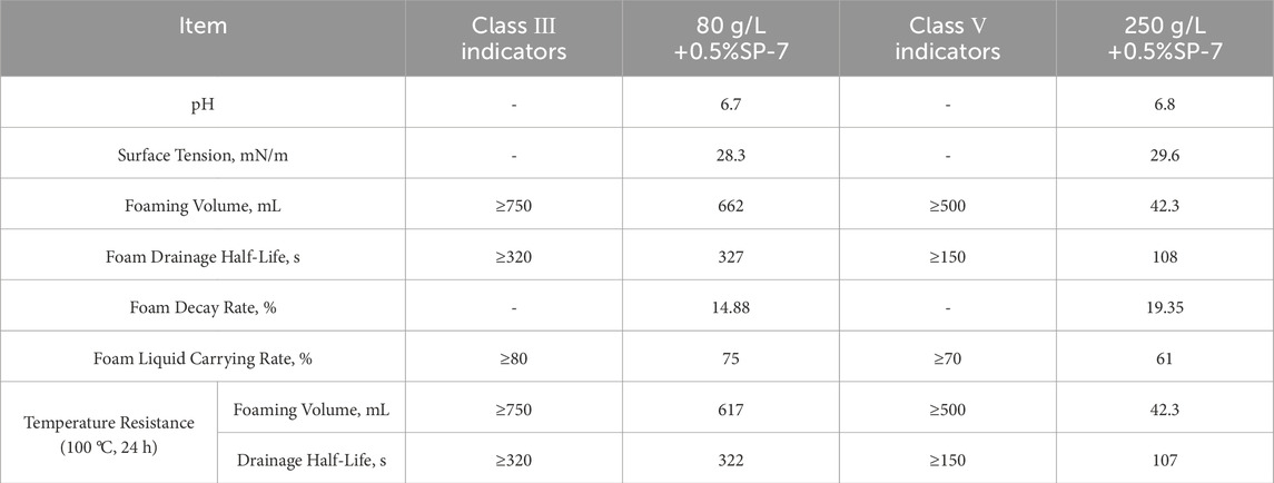 Special attention was paid to the performance of the SP-7 foaming liquid. Laboratory experiments confirm that it possesses a certain liquid-carrying capacity under low-salinity conditions, but its performance is sensitive to salinity and temperature. Concentration, gas flow rate, and temperature significantly influence its foaming and liquid-carrying capacities. Concentration affects foam generation and stability; gas flow rate determines the flow state and liquid-carrying effect; temperature impacts the physicochemical properties of the foaming liquid.