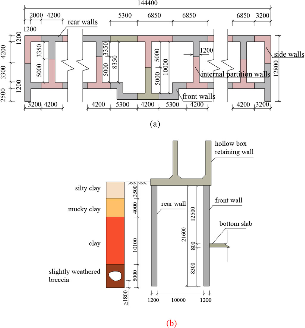 Figure 1. Structural diagrams of the diaphragm wall (unit: mm). (a) LSDW plan. (b) Lock wall elevation.