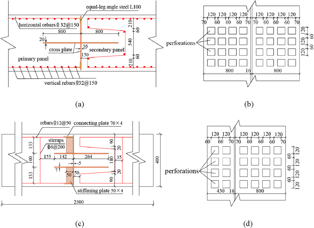 The joints between the front and rear walls employ a single-cross PCPJ configuration, characterized by a 20 mm-thick cross steel plate flange, a 16 mm-thick web plate, and 32 mm-diameter horizontal and vertical rebars. The horizontal rebars of the primary panel are welded to the steel plate through equal-leg angle steel, with a 150 mm spacing between the reinforcement cages of the primary and secondary panels. Both panels have a flange length of 800 mm. The flange is perforated with eight rows of square holes, each measuring 120 mm × 120 mm, with a net spacing of 60 mm between holes. The joints of the lattice wall employ a double-cross PCPJ configuration. The double-cross steel plate flange lengths are 430 mm for the primary panel and 800 mm for the secondary panel, with a net spacing of 300 mm between the flanges in the panel width direction. The horizontal rebars of the primary panel are welded to the steel plate using connecting plates. Additionally, a stiffening plate is installed every 1,000 mm between the connecting plate and the web plate. All other structural details are consistent with those of the single-cross PCPJ, as illustrated in Figure 2.