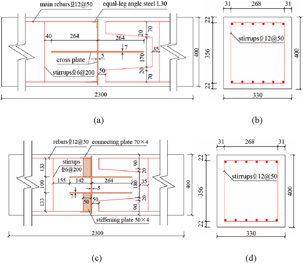 Figure 3. Specimen diagrams (unit: mm). (a) Elevation of a single-cross PCPJ specimen (b) Section of a single-cross PCPJ specimen. (c) Elevation of a double-cross PCPJ specimen. (d) Section of a double-cross PCPJ specimen.