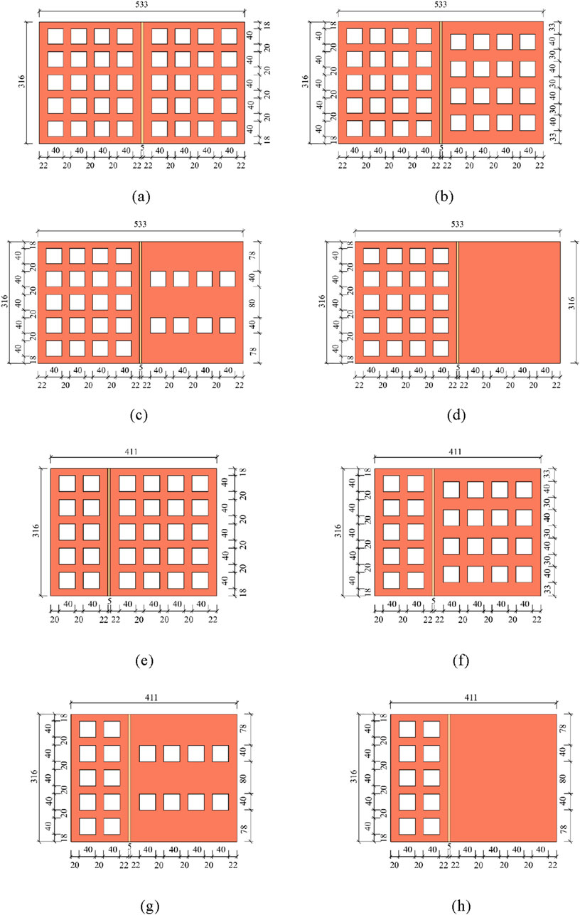 Figure 4. Flange dimension diagrams of the cross steel plate specimens (unit: mm). (a) Steel plate openings of specimen s-1. (b) Steel plate openings of specimen s-2. (c) Steel plate openings of specimen s-3. (d) Steel plate openings of specimen s-4. (e) Steel plate openings of specimen d-1. (f) Steel plate openings of specimen d-2. (g) Steel plate openings of specimen d-3. (h) Steel plate openings of specimen d-4.