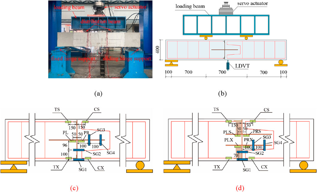 The displacement sensor of the r-1 specimen was arranged in its mid-bottom, whereas the displacement sensors of the s-1–s-4 and d-1–d-4 specimens were arranged slightly right of the mid-bottom. The r-1 specimen was not equipped with strain gauges, whereas the s-1–s-4 and d-1–d-4 specimens were equipped with steel strain gauges (TS, CS, TX, CX) in the rebar area adjacent to the steel plate. One steel plate strain gauge (PL, PR) was installed on each side of the lower flange of the single-cross steel plate, adjacent to the web plate. The strain gauge arrangement for the double-cross steel plates followed the same configuration as the single-cross case, with gauges designated as PLS, PRS, PLX, and PRX. A total of four concrete strain gauges were employed: two (SG1 and SG2) were arranged horizontally at the lower part of the specimen to monitor the plain concrete between the steel plate and the M-shaped reinforcement bars; the remaining two gauges (SG3 and SG4) were positioned vertically on the right side, covering the right steel plate flange, as illustrated in Figures 5c,d.