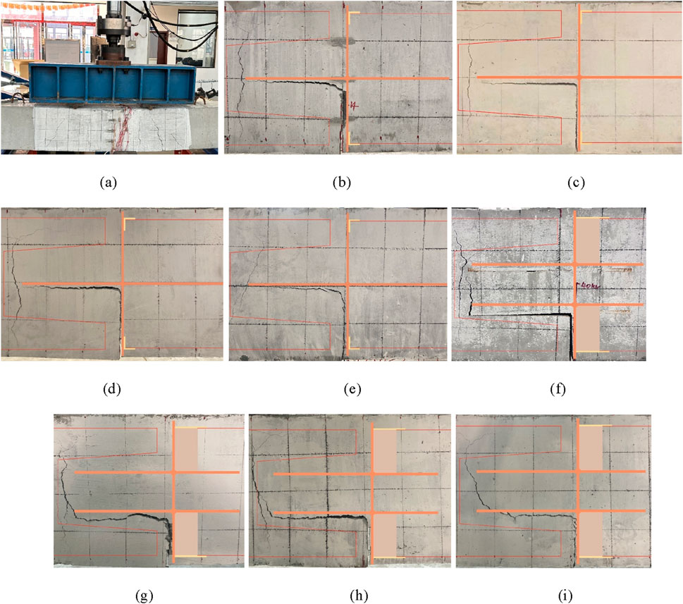 The failure modes of the specimens are shown in Figure 6. The failure mode of the r-1 specimen is a typical failure mode of an under-reinforced beam. In the failure of single-cross PCPJ specimens, cracking initiates in the secondary panel, with a through-crack extending from the bottom of the specimen along the steel plate web to the end of the steel plate flange. This forms an L-shaped crack path that rotates 90° clockwise. Additional vertical or diagonal cracks appear at the end of the steel plate flange, as illustrated in Figures 6a–e. The failure mode of the double-cross PCPJ specimens is similar to that of the single-cross specimens, with a through-crack propagating from the specimen base along the steel plate web to the end of the lower flange, where diagonal cracks are also observed, as shown in Figures 6f–i.