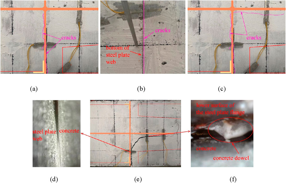Figure 8. Typical test phenomena in a double-cross steel plate specimen. (a) Initial cracks. (b) Bottom cracks. (c) Cracks propagation. (d) Web-concrete interface. (e) Failure pattern. (f) Steel-concrete interface beneath the steel plate flange.