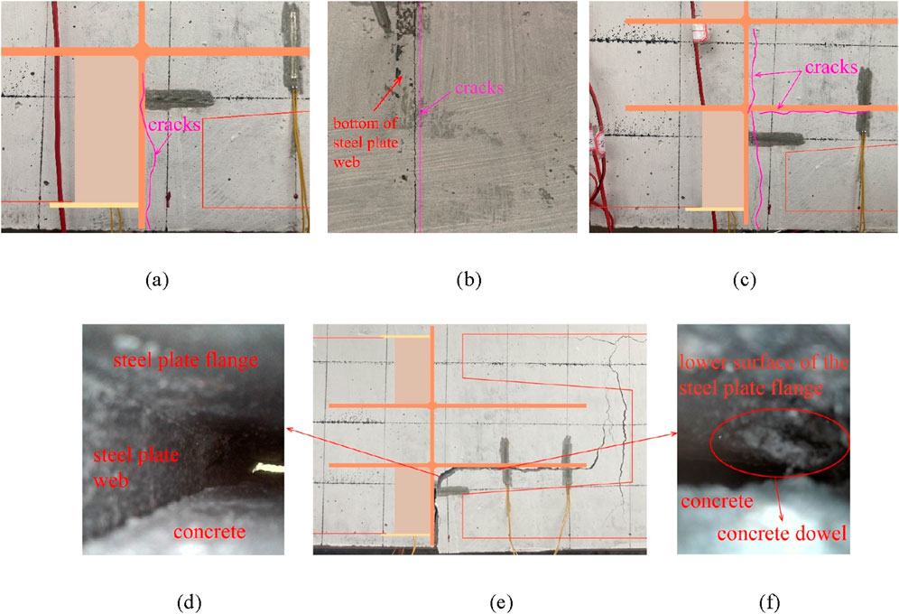 Figure 7. Typical test phenomena in a single-cross steel plate specimen. (a) Initial cracks. (b) Bottom cracks. (c) Cracks propagation. (d) Web-concrete interface. (e) Failure pattern. (f) Steel-concrete interface beneath the steel plate flange.