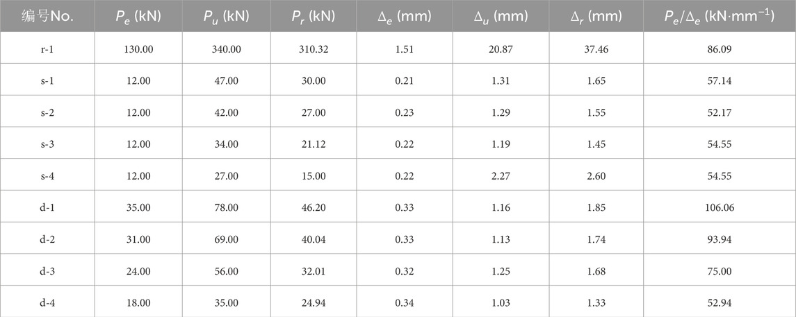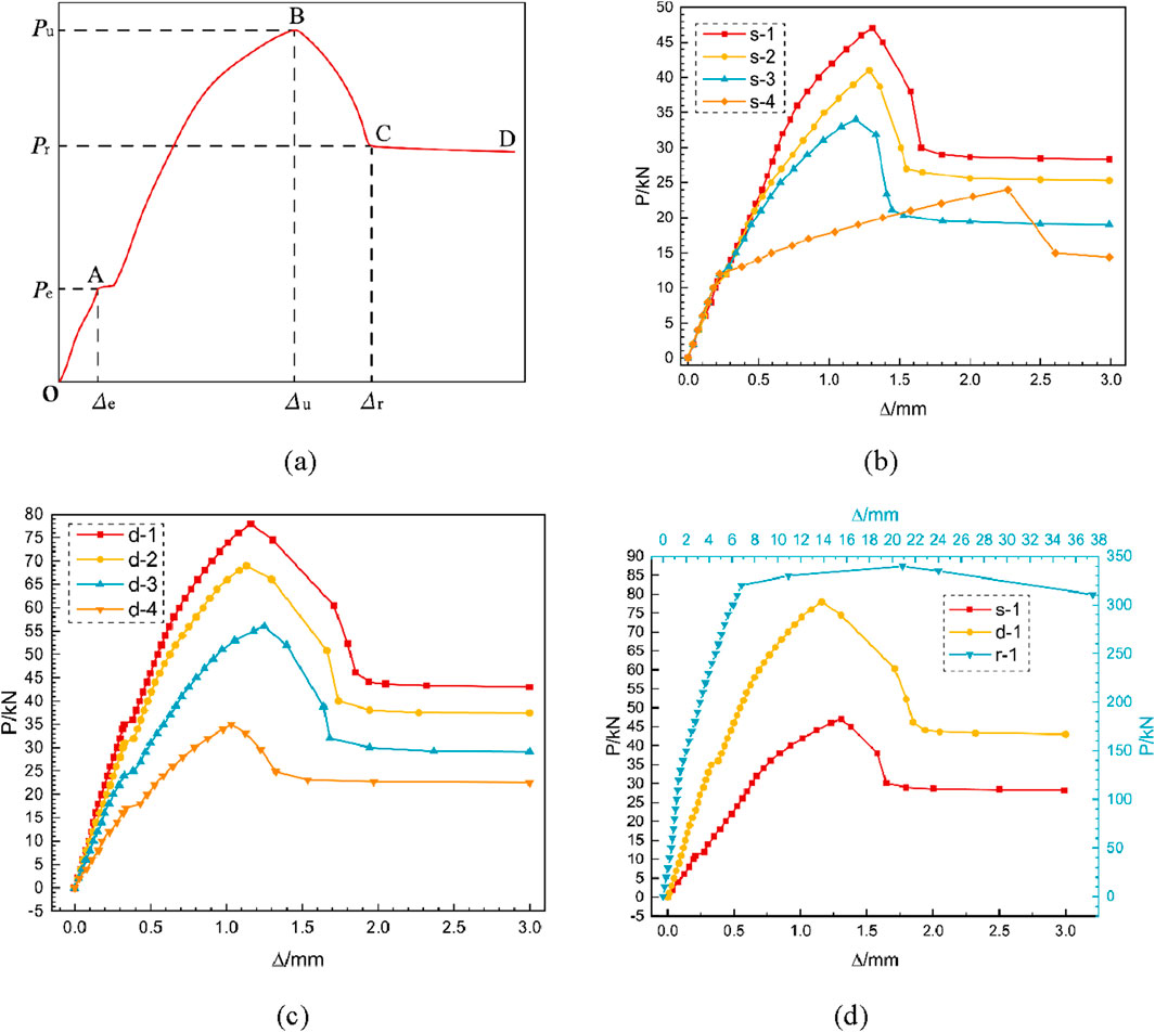 Figure 9. Load–displacement curves. (a) Typical load-displacement curves of PCPJs specimens. (b) Load-displacement curves of single PCPJs specimens. (c) Load-displacement curves of double PCPJs specimens. (d) Load-displacement curves of s-1, d-1 and r-1.