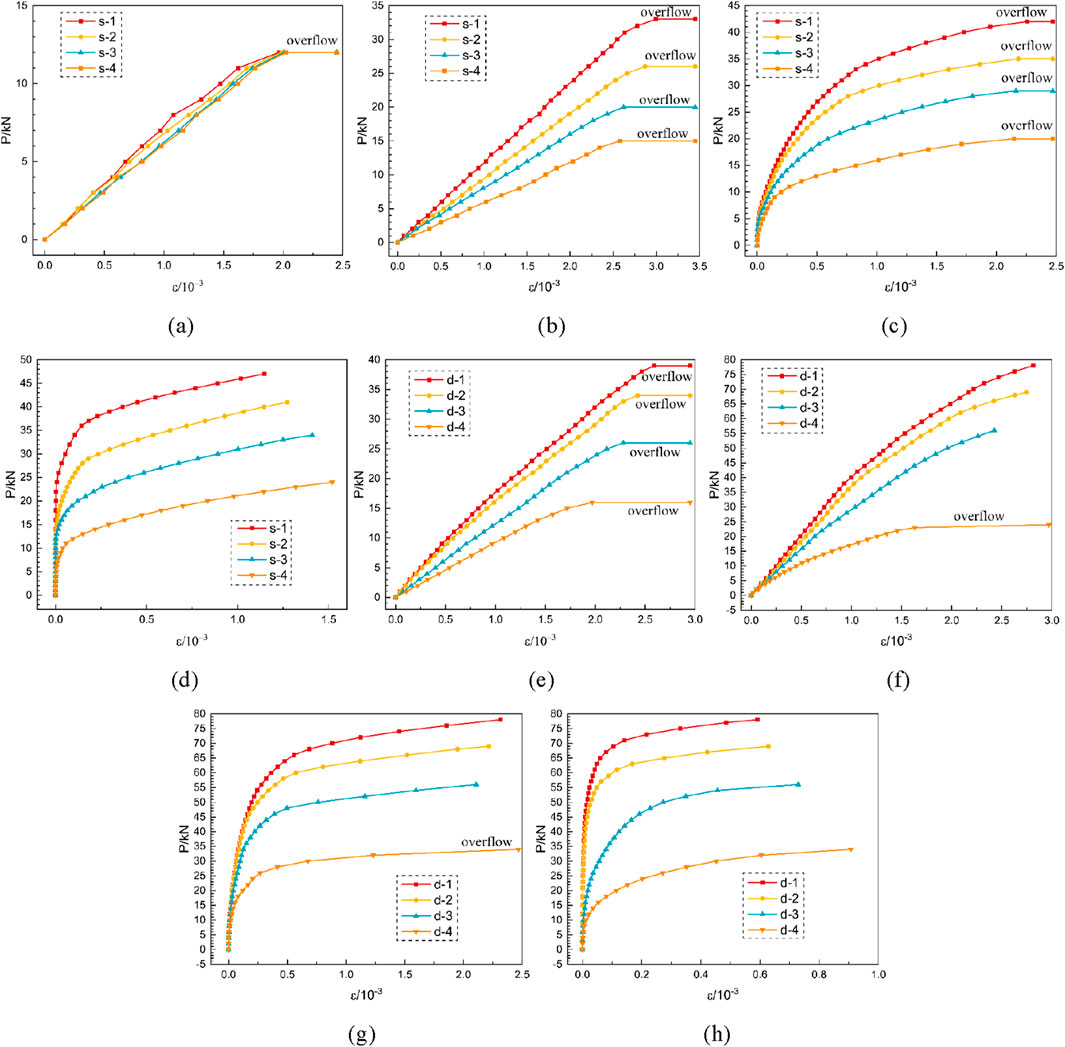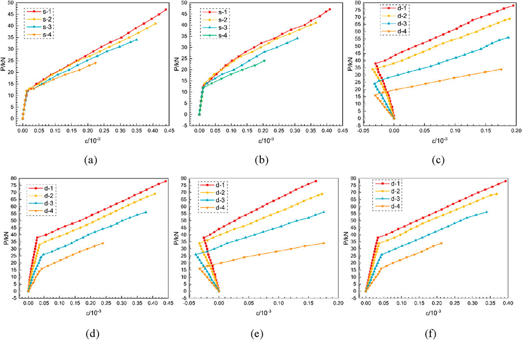 As shown in Figure 10, the load-steel plate strain curves exhibit bilinear characteristics, and the load corresponding to the inflection point is almost the same as the