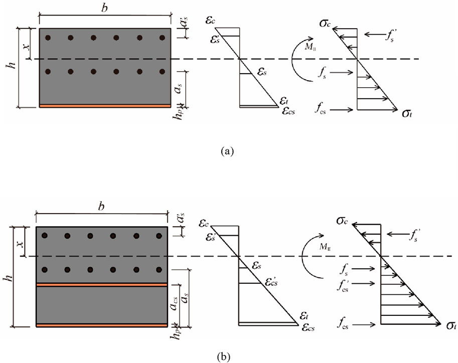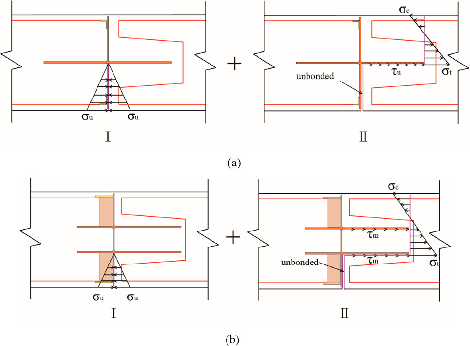 We simplify the bearing capacity into the sum of two parts. Part I separates the steel plate web and the concrete, considering only the influence of the normal stress at the interface between the steel plate web and the concrete. Part II involves the separation between the lower surface of the steel plate flange and the concrete, as well as the tensile cracking of the concrete at the flange end. Considering the end section of the steel plate flange as the object of analysis, equilibrium is achieved through the combined effects of concrete stress, steel-concrete interface stress at the flange, and rebar stress, as illustrated in Figure 12. Due to the detachment of the steel plate web from the concrete, the stress level in the concrete beneath the flange (lower flange) is relatively low and therefore excluded from the analysis.