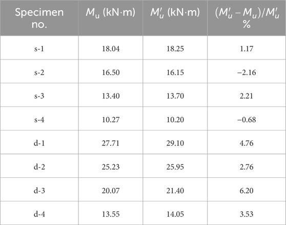 According to Table 2, the relative error between the calculated and experimental values falls within a range of −2.16%–6.20%. The small discrepancies stem from three main factors: (1) Simplified assumptions in the calculation model, such as neglecting differential biting forces at the steel-concrete interface and assuming triangular stress distribution in concrete, which slightly underestimates compressive zone contributions. (2) Material property variability: Concrete tensile strength in tests varied from the design value, affecting dowel shear resistance. (3) Measurement errors in strain gauges and displacement sensors, contributing to minor deviations in ultimate load recording. Overall, the errors are within acceptable limits, validating the model’s reliability.