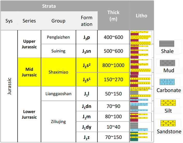 From top to bottom, the stratigraphic sequence in study area includes the Upper Jurassic Penglaizhen Formation, Suining Formation, Middle Jurassic Shaximiao Formation, Lower Jurassic Lianggaoshan Formation, and Ziliujing Formation (Cheng et al., 2023; Wan et al., 2023; Cheng et al., 2023). The Shaximiao Formation exhibits complex lithology, primarily comprising purplish-red mudstone interbedded with gray-green and gray siltstone and sandstone (Zhang et al., 2023; Yu et al., 2025).