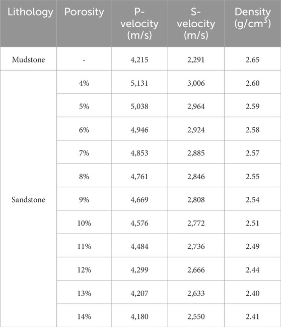 Integrated well logging and rock physics ultrasonic experimental results are compiled in Table 1, presenting elastic parameters of sands with varying petrophysical properties and typical surrounding mudstones within the study area. These data provide a critical foundation for subsequent PP- and PS-wave seismic forward modeling based on geological frameworks. Analysis reveals that PP-wave velocities exhibit greater sensitivity to lithological and petrophysical variations compared to PS-wave velocities. As porosity increases from low to high values, P-wave velocities relative to surrounding mudstones exhibit a sequential transition from high to medium and then low velocities. Notably, no petrophysical variation reduces sandstone S-wave velocities below those of mudstones.