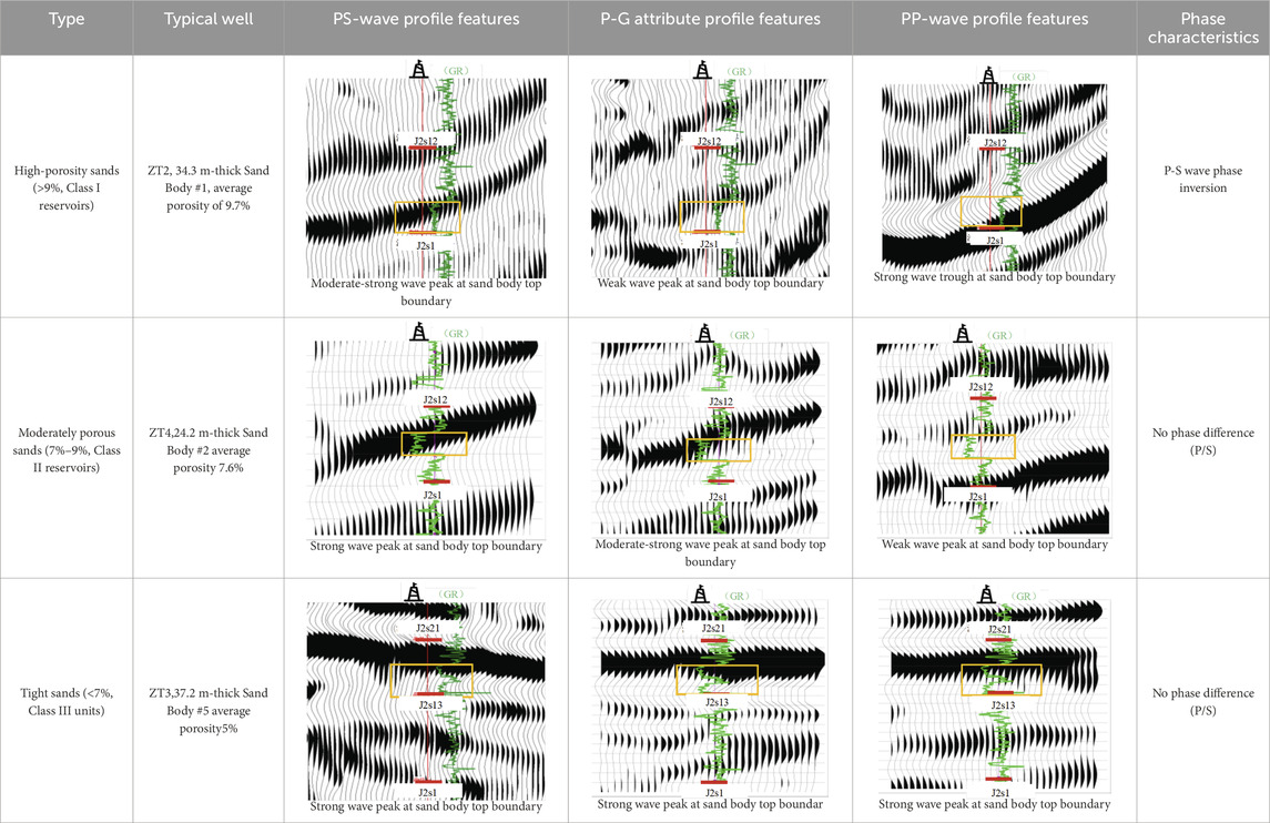 Building upon sand body phase division and lateral boundary delineation, the integrated interpretation of multi-component seismic data enables systematic identification of high-porosity sands through comparative analysis of PP- and PS-wave seismic responses. In the Shaximiao Formation of the study area, three distinct seismic response patterns were classified based on porosity variations (Table 2). High-porosity sands (>9%, Class I reservoirs) exhibit a diagnostic “S-wave peak/P-wave trough” configuration, where the top boundary corresponds to moderate-to-strong peak amplitudes on PS-wave profiles but manifests as strong trough reflections on PP-wave sections. This polarity reversal phenomenon—attributed to P-wave velocity reduction in porous gas-bearing sands—serves as a direct indicator of reservoir quality, exemplified by Well ZT2, where a 34.3 m-thick Sand Body #1 demonstrates an average porosity of 9.7%. Moderately porous sands (7%–9%, Class II reservoirs) display “S-wave strong/P-wave weak” signatures, characterized by prominent PS-wave peaks but diminished PP-wave reflectivity, as observed in Well ZT4’s 24.2 m-thick Sand Body #2 with 7.6% porosity. Tight sands (<7%, Class III units) lack reservoir potential despite showing coherent peaks on both PP- and PS-wave profiles, reflecting lithologic presence without effective porosity. The pre-stack P-G attribute bridges PP/PS datasets by correlating PS-wave peaks with PP-wave troughs, facilitating high-porosity sand mapping through amplitude-thresholded geobody extraction.