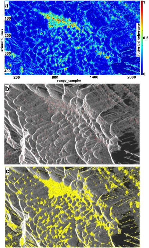 Figure 3. Point selection results: (a) Posteriori coherence; (b) Point selection results based on spectral characteristics and backscatter coefficient; (c) Point selection results based on homogeneous samples.