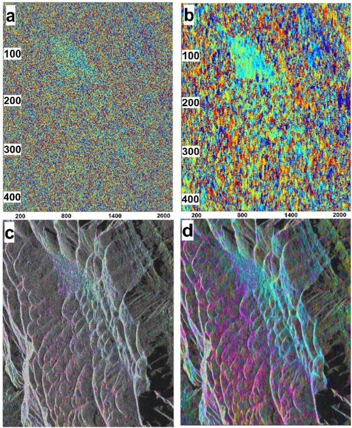 Figures 4a,b show the comparison before and after optimization for the 20231019_20231031 interferogram, where the XY axes represent pixel distance. The interferogram before optimization exhibits significant noise, particularly at the boundaries of high-coherence regions, where the image details are blurry, affecting the accuracy of deformation analysis. After applying the Phase Linking technology, the optimized interferogram can more stably and reliably extract phase information, with significantly improved boundary clarity and overall phase recovery. Compared to traditional spatial filtering methods, Phase Linking filters in the time domain, which more effectively captures the spatiotemporal characteristics in the observational data, thus optimizing the phase recovery.