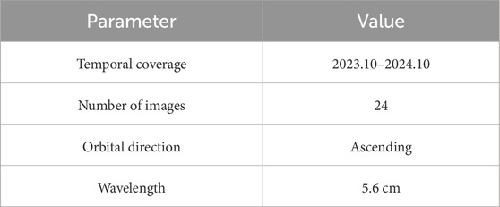 The Sentinel-1A satellite is the first environmental monitoring satellite in the European Space Agency’s Copernicus program. It offers advantages such as high-frequency revisit, wide coverage, rich polarization and operational modes, as well as high reliability. In this study, a total of 24 Sentinel-1A satellite images from October 2023 to October 2024 were selected, covering the study area. The image data are in Level-1 SLC format, with an interferometric wide swath (W) imaging mode, VV polarization, an incident angle of 28.9°, and a spatial resolution of 5 m × 20 m (in azimuth and range directions) (in Table 1). Additionally, precise orbit data provided by the European Space Agency were used for orbit correction, and external reference DEM data from the 30-m resolution SRTM Digital Elevation Model (DEM) were used.