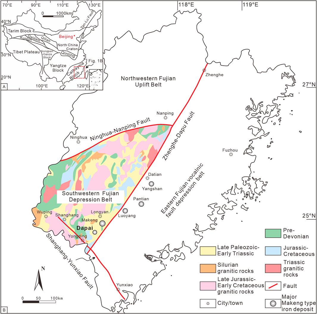Figure 1. (A) Simplified tectonic map of China showing the location of the study area (modified after Li et al., 2016). (B) Simplified regional geological map of the Southwestern Fujian Depression Belt, showing the distribution of the major Makeng-type iron deposits (modified after FJIGS, 2016).