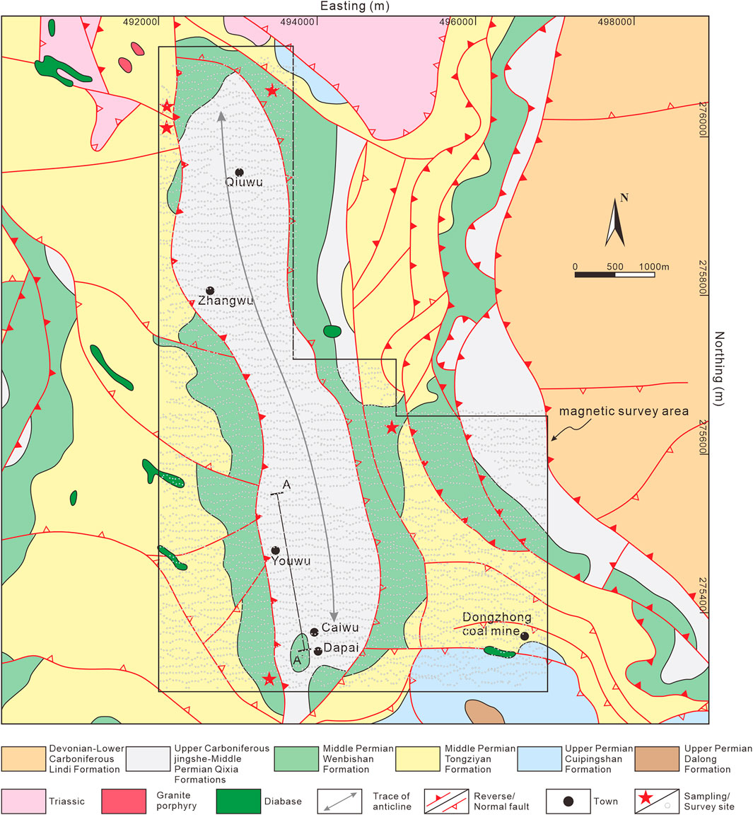 Figure 3. Geological map of the Dapai iron–polymetallic deposit and surrounding area. The black polygon and hollow dots represent the ground magnetic survey area and survey sites, respectively.