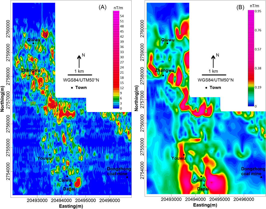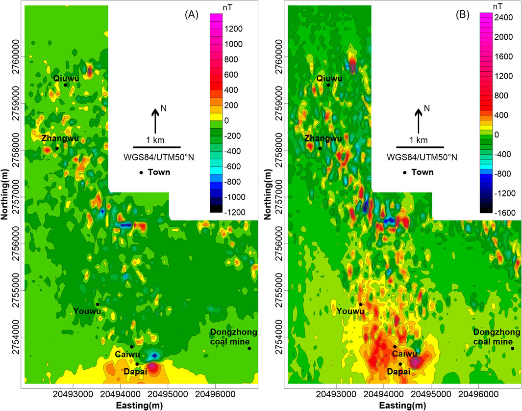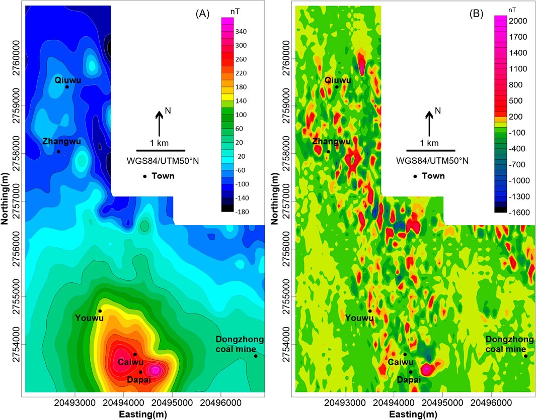 The central of the study area is generally in the strong NW-trending anomaly field, consisting of several local magnetic anomalies randomly distributed with amplitudes ranging from −1,384 nT to 1,369 nT. The anomaly distribution characteristics in the central part are slightly different in the north and south. The northern part is a beaded strong magnetic anomaly zone with a pronounced oriented arrangement whereas the southern part exhibits relatively clustered features that correspond to the Dapai deposit in exploitation.