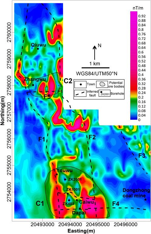Region C2, between F1 and F2, is on the eastern part of Zhangwu. The anomaly of region C2 has smaller scale covers about 0.8 km2, with a medium amplitude ranging from −692 to 626 nT. The region C2 anomaly disappeared in the upward continuation map, indicating that its magnetic source is shallow. Besides, there is an inferred E–W striking fault, F5, in region C2, depending on the THD and structure map (Figures 6, 7) The C2 moderate anomaly is probably related to the magmatic rocks distributed along the faults, or the Permian Qixia Formation, which is the main exposed stratum in region C2. Moreover, the influence of the dense residential area in region C2 should not be neglected. Thus, there is relatively less mineralization potential on region C2.