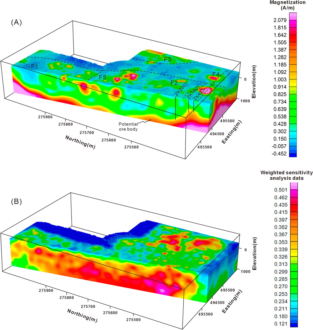 Figure 8. (A) Three-dimensional magnetic inversion result of the study area. The inferred faults are marked with black dotted lines and the location of boreholes are shown in the model. (B) Normalized sensitivity analysis data of magnetic weighted kernel matrix.