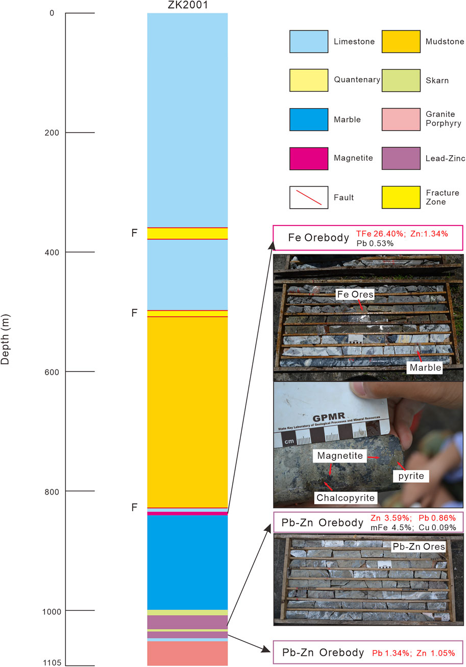 Drill hole ZK2001 revealed at least three-layers of Fe-Pb-Zn ore bodies. It also disclosed relatively strong alteration at depth and the existence of an intrusion associated with the mineralization. As is described above, the Dapai deposit is closely controlled by structures and strata. Based on the geological characteristics of the study area, it can be concluded that the increasing depth of the ore bodies and the NNW-oriented magnetic anomaly are affected by the faults and NNW-plunging fold. As a consequence, there is still great potential for the deeper and more peripheral prospecting to the north of the Dapai deposit.