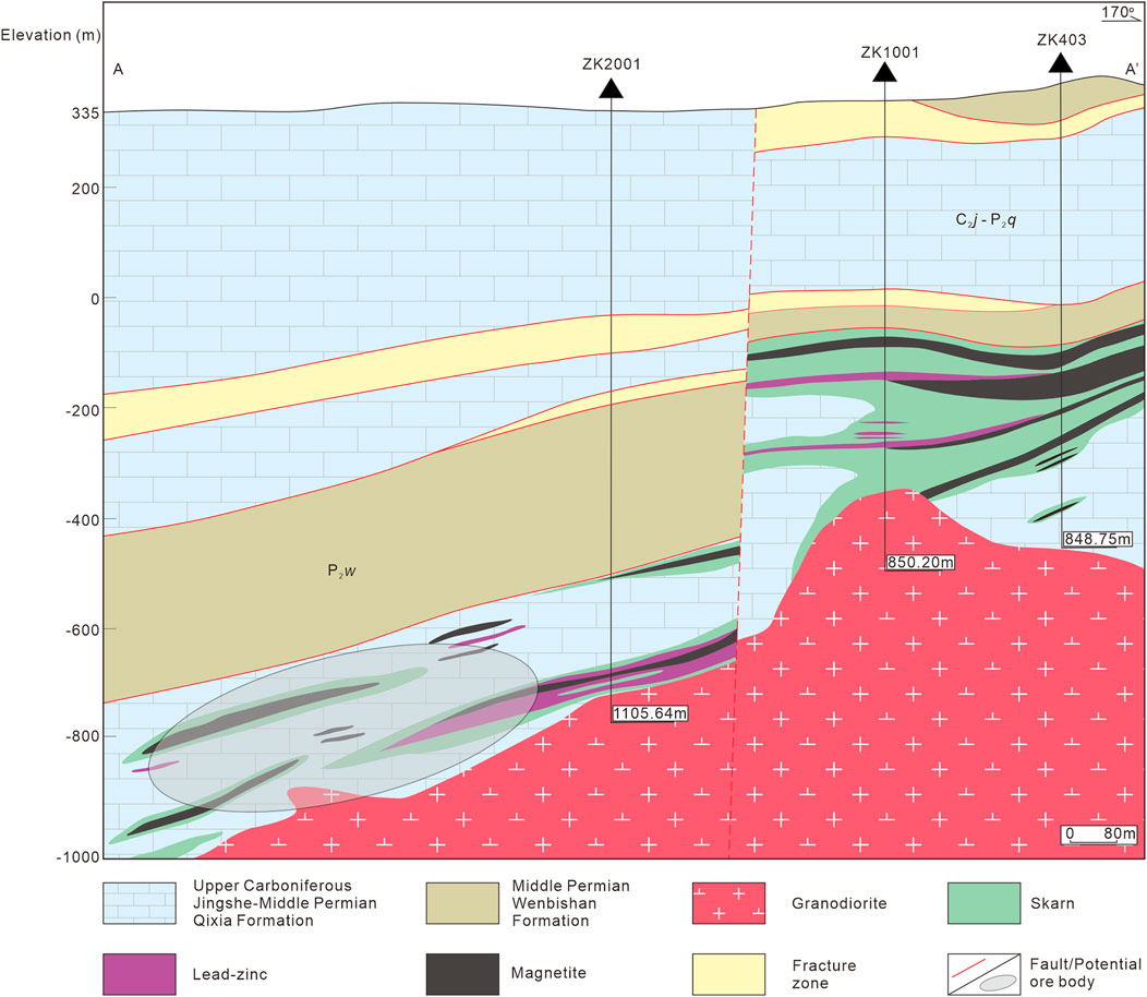 As is shown in Figure 9, the drilling results reveal thrust nappe structures between the Qixia and Wenbishan Formations at a depth of around 550 m. The decollement fault between the Wenbishan formation and Qixia formation is about 850 m deep, developing magnetite ore body within its fracture zone with a total Fe grade of 26.40%. The 850–1,014 m limestone stratum exhibits strong marbleization, with a local multi-layer skarn. Between 1,014 m and 1,054 m there is two-layers of lead-zinc mineralization, accompanied by magnetite and chalcopyrite mineralization (mFe 4.5%, Cu 0.09%).