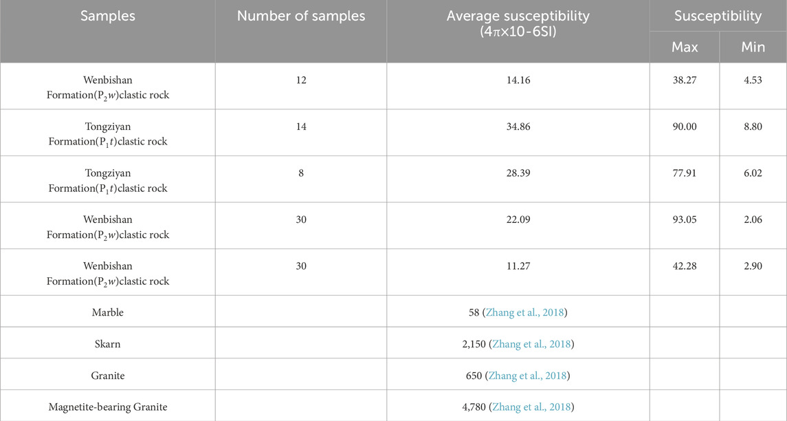 The magnetic susceptibility of 94 rock samples from the study area was collected and measured to determine their physical properties. The results are listed in Table 1.