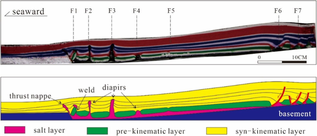 Syn-kinematic sedimentation was simulated by sieving equal-thickness sand layers (dyed for visualization) at fixed time intervals corresponding to geological periods (Table 2), thereby capturing sediment deposition during active deformation. Structural evolution was monitored via overhead time-lapse photography to document planform development. Post-experiment stabilization through water saturation enabled detailed cross-sectional analysis via serial slicing perpendicular to the structural trend.