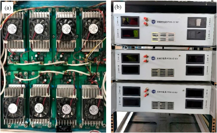 Figure 2. Internal and external physical views of the DC power supply chassis. (a) Array-configured modules of the power supply’s internal structure; (b) External view of the power supply chassis.