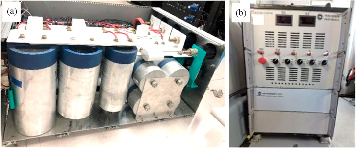 Figure 3. The internal and external entity diagrams of the transmitter. (a) Internal structure diagram of the transmitter. The cylindrical object represents multiple sets of parallel high-voltage energy storage capacitors, which achieve instantaneous kilo-ampere current output through coordinated charging and discharging; the white module on the upper right is the overvoltage protection device, which can effectively suppress the current rebound during the shutdown moment and ensure the safety of system components. (b) External operation panel of the transmitter. It is equipped with clearly segmented adjustment units, enabling flexible configuration of transmission parameters and quick switching of working modes.