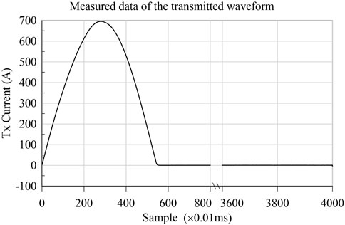 The current system primarily employs a half-sine wave as the transmission waveform, while also incorporating alternative waveform designs such as trapezoidal waves and multi-waves (a combination of half-sine waves and small trapezoidal waves). However, due to the specific requirements of practical exploration tasks, these waveforms have only undergone preliminary testing and have not yet been deployed in field operations. Based on the electrical characteristics of the subsurface media in the target area and the desired exploration depth, a transmission current of 700A is selected to meet the detection requirements. The system sampling rate is set to 100 kHz, with a fundamental frequency of 12.5 Hz, corresponding to a half-period of 40 ms for the half-sine wave. As shown in the measured waveform in Figure 5, the power-on time is 5.5 ms, and the power-off time is 34.5 ms. The current shutdown process is clean and sharp, with no adverse phenomena such as rebound, jitter, or tailing, fully demonstrating the excellent stability of the transmission system.
