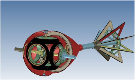 Figure 6. Schematic diagram of the internal three-component sensing coil structure of the receiving pod. The X, Y, and Z component coils are symmetrically distributed in a hexahedral configuration, with a suspension and shock absorption mechanism placed at the center, effectively suppressing mechanical vibration noise caused by air flow disturbances. The tail of the pod adopts an aerodynamic shape design, further enhancing the attitude stability during flight and ensuring the quality of data collection.