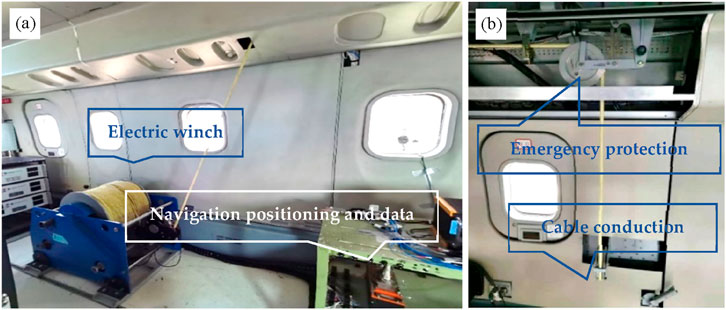 Figure 7. Receiving pod programmed winch take-up device. (a) Electric winch, navigation positioning and data acquisition; The receiving pod is operated for retraction and release through the electric winch. (b) Emergency protection device and cable conduction mechanism. When an uncontrollable situation occurs in the receiving pod and affects the safety of the aircraft, the emergency protection device will take cut-off measures to ensure the safety of the aircraft.