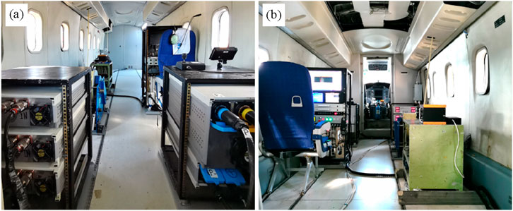 Figure 9. Interior layout of the Y12F aircraft platform after modification. (a) View from the front of the cabin, showing core equipment such as high-power power supply, launch host, and electric winch; (b) View from the rear of the cabin, presenting auxiliary units such as data collection system and human-computer interaction terminal. The integrated layout throughout the cabin takes into account functional zoning and operational space, ensuring efficient coordination of the avionics system.