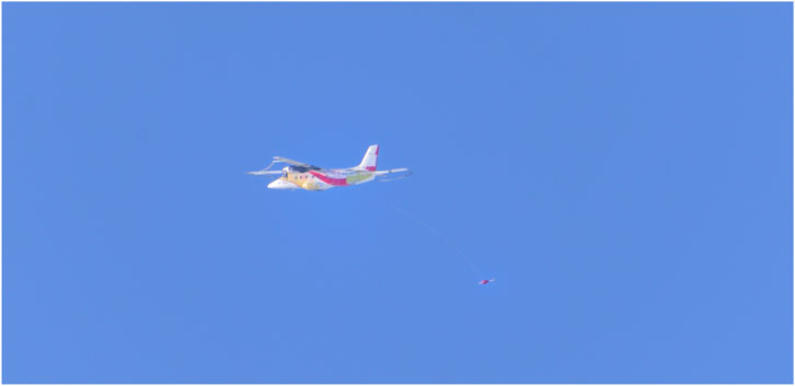 Figure 11. The aerial operation mode of the iFTEM-II system. The receiving pod is positioned behind the aircraft in a trailing manner and is used to collect the secondary field signals generated by the sensing of underground media.