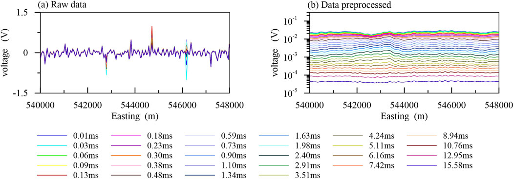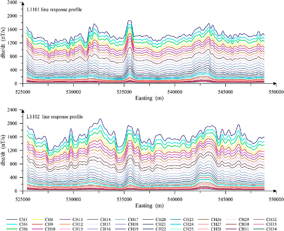 Figure 12a visually demonstrates the profile of raw data streams, where strong noise in dynamic interference environments is evident, overwhelming the weak electromagnetic response signals. After data preprocessing, the noise is effectively suppressed. Figure 12b clearly displays the nanovolt-level secondary field response signals. The comparative results before and after preprocessing not only validate the effectiveness of the processing method but also provide reliable profile characteristic information for interpreters, establishing a solid foundation for geological interpretation work.