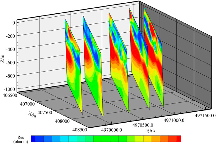 Figure 13. 3D inversion of measured data from the iFTEM-II system. The inversion profile clearly reveals the electrical characteristics of the subsurface formation in the survey area: the shallow section (above 100 m) exhibits interbedded high and low resistivity layers, the middle section (100–200 m) contains a distinct low-resistivity anomaly zone, while the interval from 200 to 500 m is characterized by a continuous high-resistivity layer.