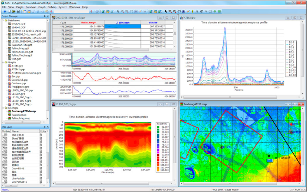 Figure 14. Time domain airborne electromagnetic data processing software. The platform adopts a modular layout: the upper part is the function toolbar, the left side integrates the project management and database display area, supporting the classified storage of data in the work area; the main interface of the working area can synchronously display multi-dimensional information such as data columns, profile curves, single-point attenuation curves, spectrum curves, *.map format mapping, inversion result mapping, and geological base maps. The system covers core functional modules such as database management, visualization analysis, and data processing.